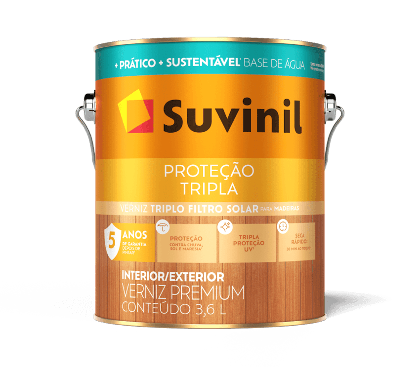Junte a qualidade de um verniz tripla proteção com uma tecnologia que usa água para diluir. Esse é o Suvinil Verniz Seca Rápido. Protege a madeira contra chuva e sol, com secagem ao toque em apenas 30 minutos. E o melhor: tudo isso com 5 anos de garantia pra cobertura.