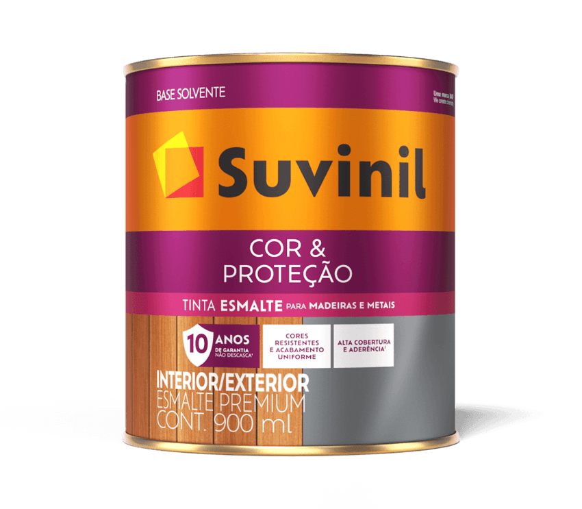 Suvinil Esmalte Cor e Proteção é a melhor tinta para pintar madeira e metal. Versátil de verdade, ela renova superfícies de dentro e fora da sua casa, combinando acabamento, cobertura e uma fórmula com silicone que não deixa sujeiras. Sua 2ª demão pode ser aplicada após 45 minutos, mesmo que a 1ª não esteja seca. Suvinil Esmalte Cor e Proteção é prático, fácil de aplicar e não descasca.