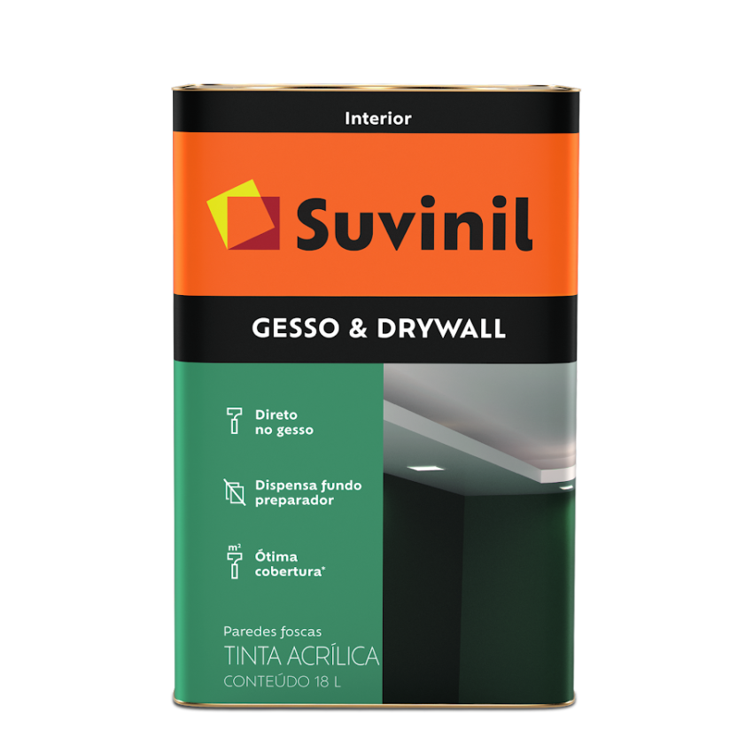 A tinta Suvinil Gesso & Drywall dispensa o uso de fundo preparador porque vale por duas. É o fundo e o acabamento da sua parede em uma única lata. Ideal para ser aplicada diretamente no gesso, drywall, reboco, textura, massa corrida e massa acrílica.